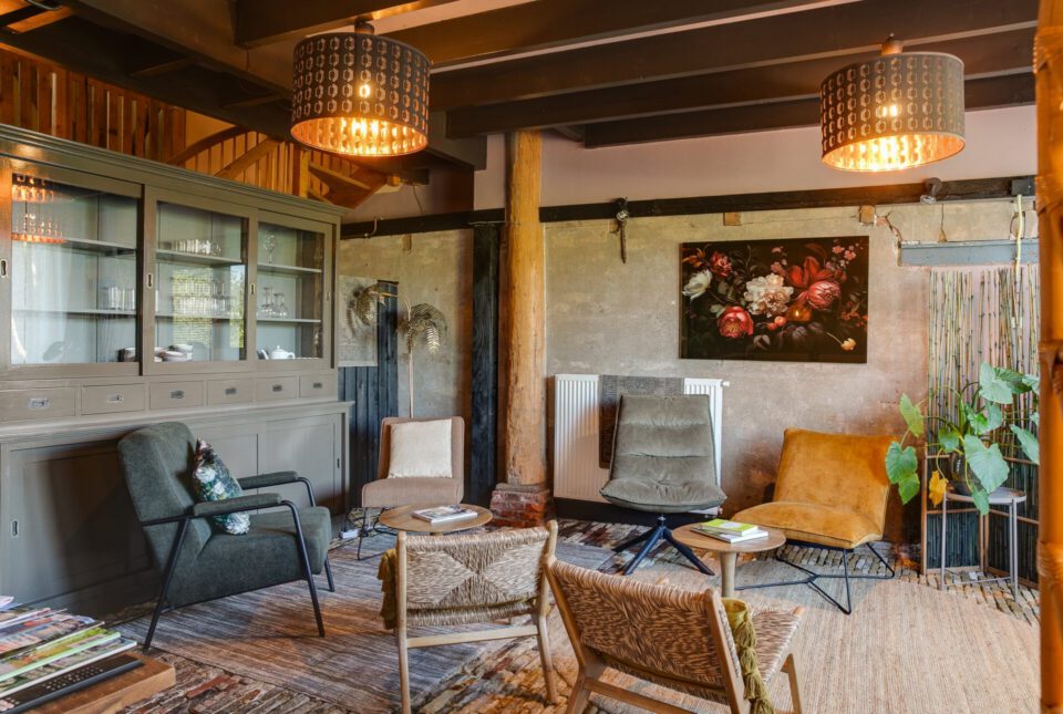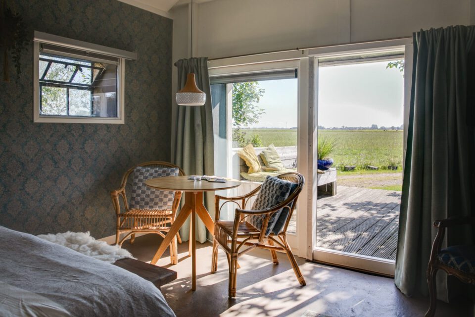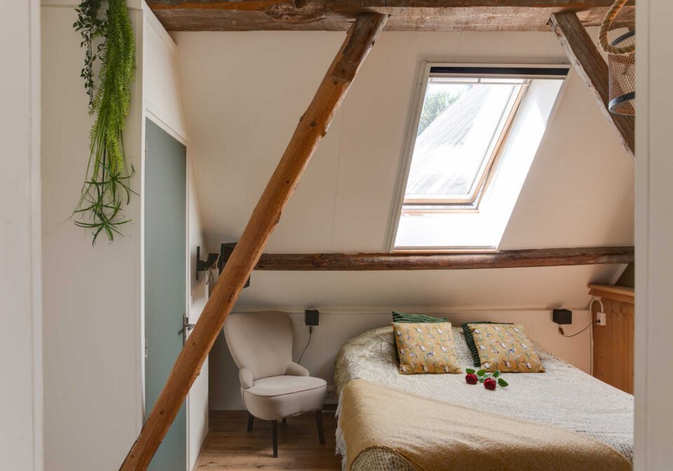 • De Weelderige Wouw, frisse kamer met 2 persoonsbed, een ruime zithoek en ingericht met warme oker elementen.