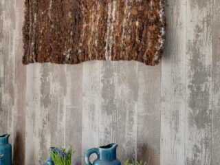 Ingericht met veel wit, een wand met prachtig behang, tweed vloerkleed en kunstzinnige wol-elementen